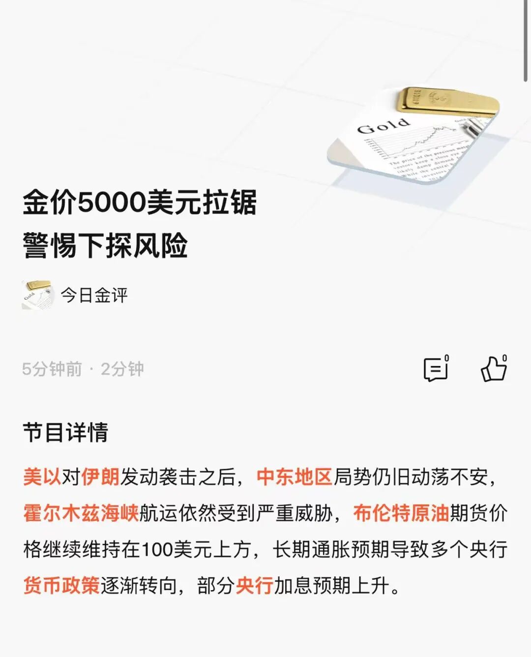 针对当前金价低迷的核心原因,高级黄金投资分析师徐世伟分析,自美伊冲突爆发以来,金价便持续走弱,背后是两大利空逻辑持续主导市场,且尚未出现实质性扭转。