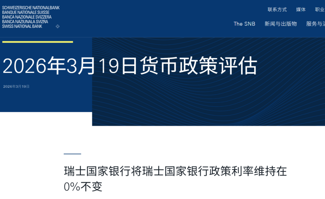 3月19日,瑞士央行公布最新货币政策评估,将政策利率维持在0%不变,继续执行“0利率”。