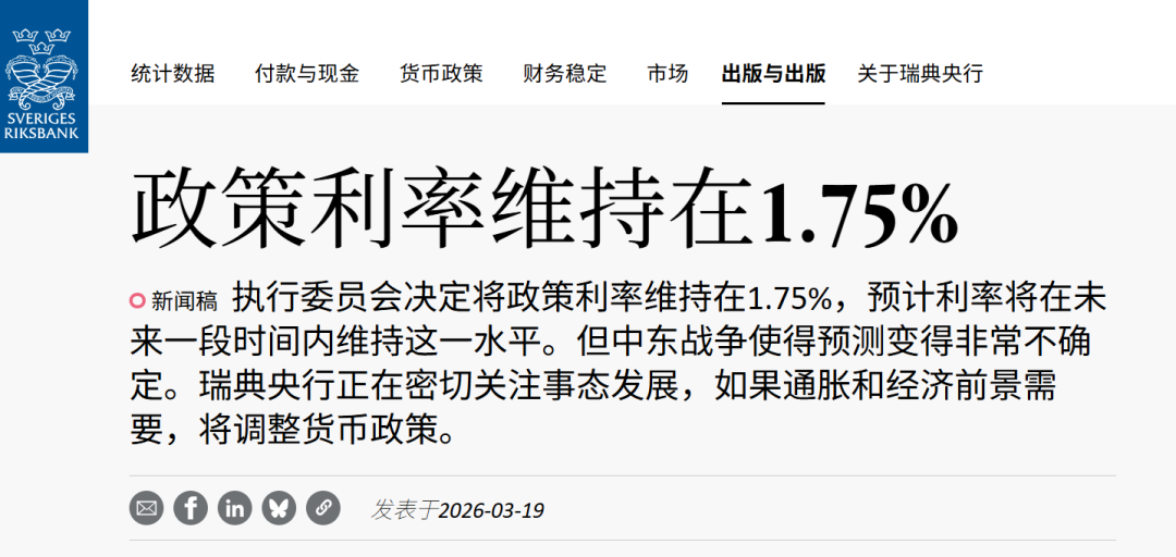 选择“按兵不动”的还有瑞典央行。3月19日,瑞典央行宣布维持政策利率在1.75%不变,这与之前的信号一致。