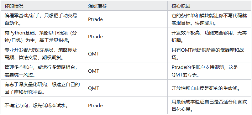 如果你确信自己是“技术极客”或已有明确的高频/复杂策略构想,可以直接从QMT开始,但要做好前期投入大量学习时间的准备。