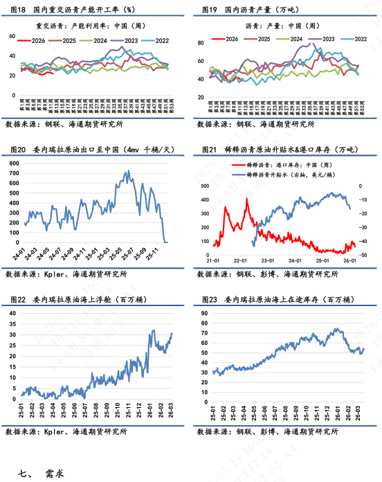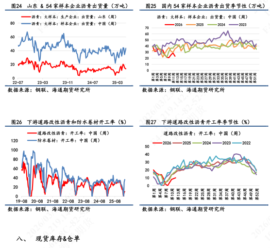 【2】现货基本面:截止3月20日当周,供应端,国内炼厂产量为38万吨,环比下跌7.3%;需求端,大样本国内企业出货量为23.37万吨,同比下跌18%;库存端,厂内+社会库存累计105.9万吨,环比下跌0.7%。其中厂库录得52.9万吨,环比回落3%;社会库存录得53万吨,环比上涨2%(仍未突破2025年均值线)。利润端,隆众统计的沥青生产毛利为-715元/吨,环比毛利亏损持续扩大。地缘持续进展下,成本端重心不断上移,带动沥青盘面价格大幅上涨,保成品油供应下产量下滑兑现在数据上,高价无市状态兑现在需求数据上。社会库存暂且以部分炼厂囤货以待高价卖货为形态出现。短期沥青基本面格局偏紧。