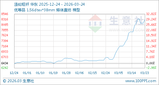 3月24日,生意社涤纶短纤基准价为8306.81元/吨,与本月初(6611.53元/吨)相比,上涨了25.64%。