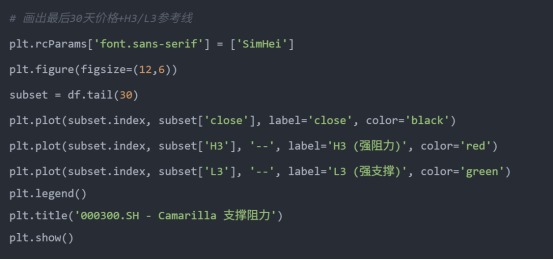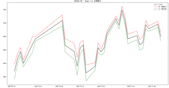 运行后就能看到最近一年的收盘价,以及 H3/L3 两条关键参考线。