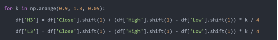 Step 2 参数扫描,在一组系数范围内循环(例如 0.9 → 1.3,步长 0.05), 每次用公式计算出 H3/L3、H4/L4 等水平线。