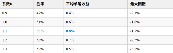 可以看到,大约在 1.1~1.2 附近效果最优。 但如果换成波动率高的创业板,就可能是 1.2~1.25 最优。