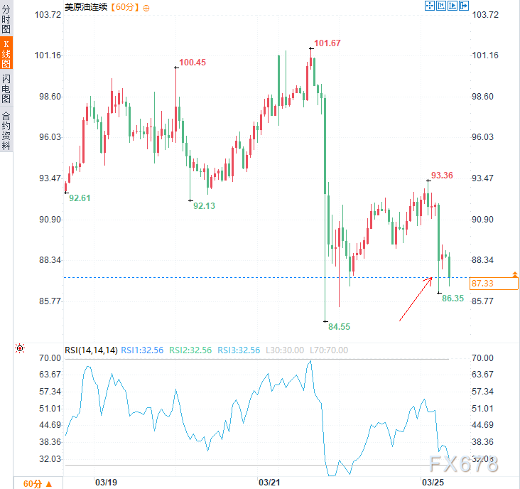 (美原油连续小时图,来源:易汇通)