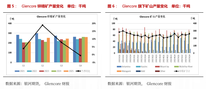 我们对海外10家矿企锌矿产量进行汇总,2025年全年锌精矿产量430.23万吨,同比+2.61%。2025年四季度锌精矿产量115.58万吨,环比-0.79%,同比+4.24%。需要注意的是Boliden从Lundin Mining收购了Neves-Corvo和Zinkgruvan矿山,这两座矿山于4月16日并入Boliden。为了数据统计更加直观,我们将汇总表中Lundin Mining锌精矿产量数据并入Boliden。