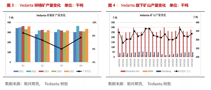 2025年Vedanta锌精矿产量133.5万吨,同比+7.4%。其中四季度,Vedanta锌精矿产量33.5万吨,环比+5.35%,同比7.72%。产量同比增加主印度本土的矿山开采量增加。