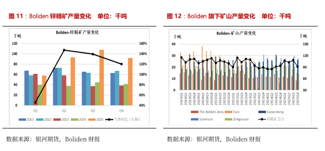 2025年Boliden锌精矿产量35.08万吨,同比+113.74%(Boliden从Lundin Mining收购了Neves-Corvo和Zinkgruvan矿山,这两座矿山于4月16日并入Boliden)。2025Q4 Boliden产量9.18万吨,环比-14.96%,同比+23.91%。2025年四季度Boliden产量环比下滑,一方面因为所有矿山的磨矿量均出现减少;另一方面因Tara和Zinkgruvan矿石品位下降。同比产量增加主因Somincor和Zinkgruvan的新增产能以及Tara的重启。