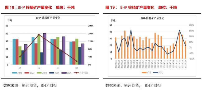 2025年BHP 锌精矿产量12.94万吨,同比+69.39%。2025Q4产量2.7万吨,环比-25%,同比+18.5%。全年产量增加主因Antamina采矿顺序调整,产量大幅增加。但随2025年四季度采序倾向铜,锌产量呈现下滑。