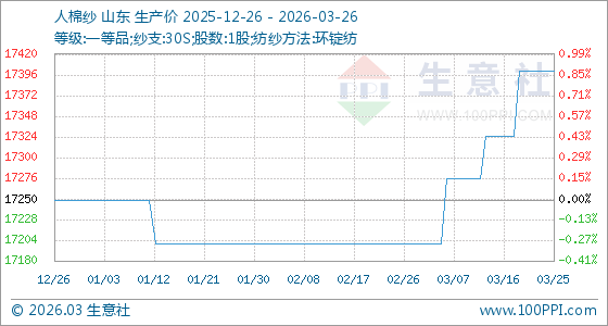 3月26日,生意社人棉纱基准价为17400.00元/吨,与本月初(17200.00元/吨)相比,上涨了1.16%。