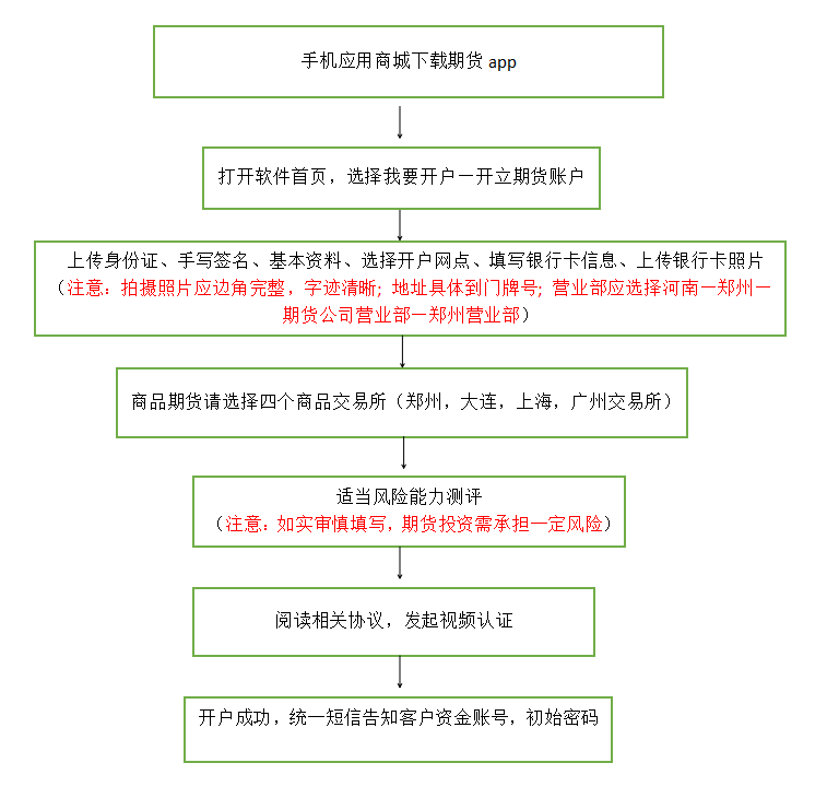 整个在线开户流程非常标准化,跟着期货公司的APP提示一步步操作即可。我为你整理了一个流程图,可以让你对整个流程一目了然: