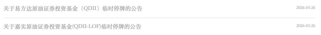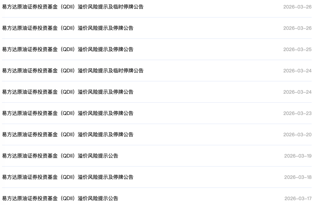 3月26日午间,深交所发布公告,嘉实原油LOF、原油LOF易方达,因二级市场溢价幅度未回落,于当天下午开市起至收市实施临时停牌。此外,南方基金也发布公告,截至3月26日上交所午间收盘,南方原油LOF二级市场交易价格明显高于基金份额净值,出现较大幅度溢价,于当天下午开市起停牌至当日收市。