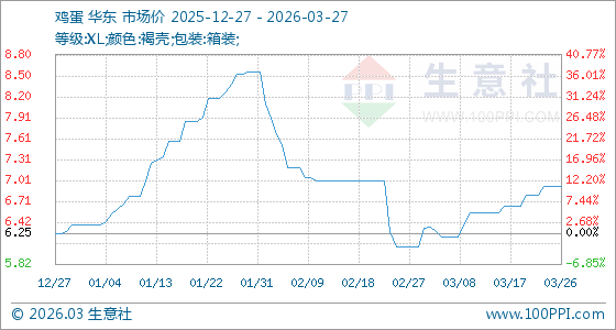 3月27日,生意社鸡蛋基准价为6.92元/公斤,与本月初(6.07元/公斤)相比,上涨了14.00%。