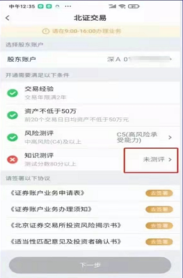 通过校验后,需要进行北交所知识测评。题目主要涉及涨跌幅限制(30%)、盘中临时停牌机制等。建议提前阅读相关规则,通常得分80分以上即可通过。