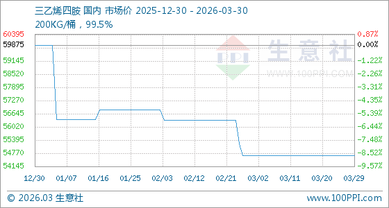 3月30日,生意社三乙烯四胺基准价为54666.67元/吨,与本月初持平。