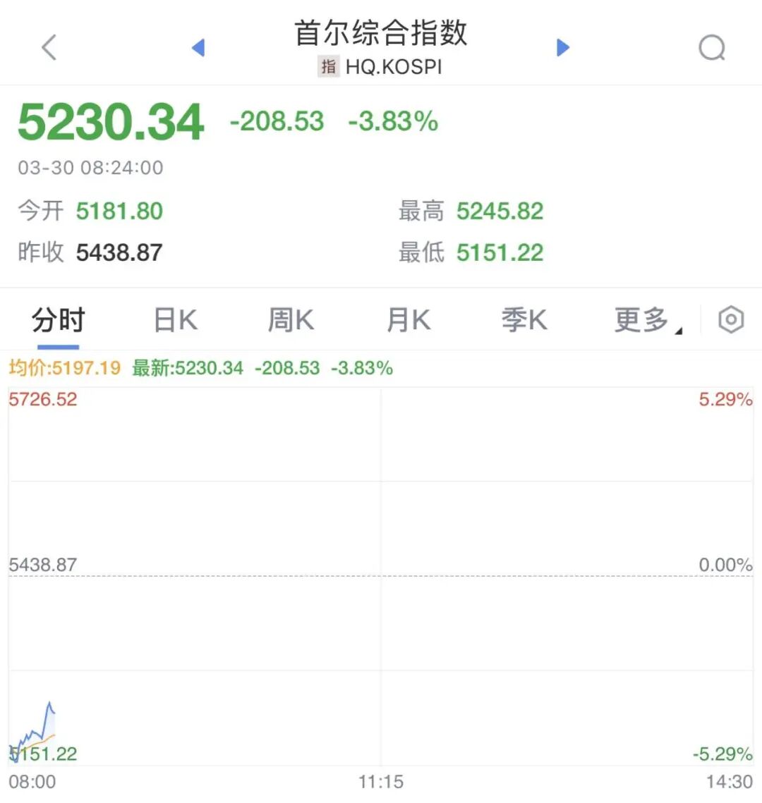 3月30日,日韩股市大幅低开,日经225指数一度跌超5%,最新报50869.3点。