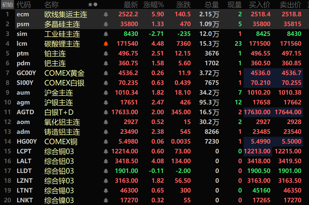 美元下跌金属普涨伦铝、碳酸锂涨超4%沪锡、铂、沪银涨逾2%【SMM午评】