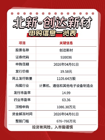 周三(2026年04月01日),北交所申购创达新材!