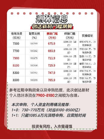 根据近期北交所新股的户数结构、申购热度、发行参数进行测算整股门槛以及碎股线,本次创达新材的申购冻结资金区间分布在7500亿至8500亿元之间,中枢预估是8000亿元,个人预计冻资在7900-8100之间。整股、碎股门槛如图2所示。