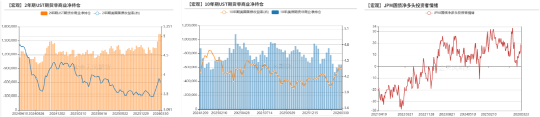 截至3.24的数据,长短端美债利率持仓分化,2年期UST期货非商业净持仓空头增加155,512手至1,638,179手;10年期UST期货非商业净持仓空头增加44,009手至641,887手。