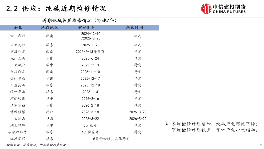 供应:本周纯碱供应环比下降。本周纯碱检修安排增加,产量环比下降。下周纯碱检修计划较少,预计产量小幅增加。近期纯碱检修安排减少,新增产能投放,供应端压力较大。