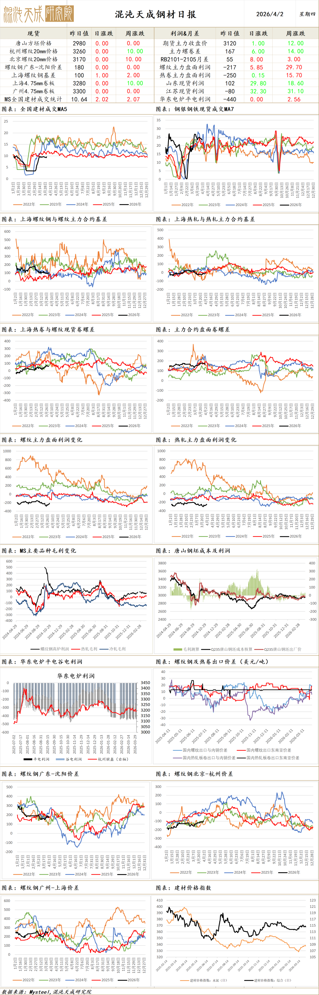 1.本周,唐山主流样本钢厂平均铁水不含税成本和平均钢坯含税成本变化较小,与4月1日当前普方坯出厂价格2980元/吨相比,钢厂处于微利水平。