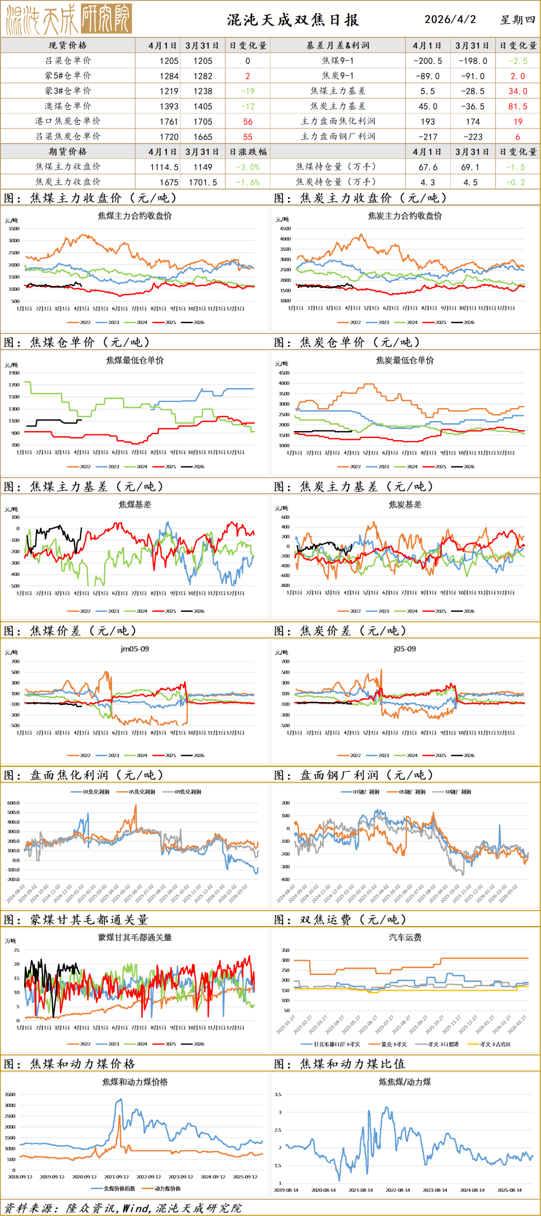 2.中国煤炭资源网冶金部4月1日重点关注:焦炭方面,今日首轮提涨正式落地执行,涨幅为50-55元/吨。随着期货盘面回落,黑色系市场情绪有所转弱,部分高价煤种开始下调报价,但由于前期焦煤价格上涨幅度较大,焦炭入炉成本维持在高位,不过焦企目前仍保有一定利润,生产多维持稳定。需求端,在盘面影响下钢材市场也稍有转弱,成材库存压力仍存,多数钢厂对焦炭采购保持稳定,少数库存偏低钢厂采购相对积极。整体来看,市场情绪虽有所转弱,但当前焦炭供需结构尚可,后期需关注煤价回落幅度以及国际局势走向。焦煤方面,随着煤价前期快速大幅上涨,本周下游采购情绪明显降温,中间环节谨慎观望,积极出货为主,煤矿新签单不佳,价格承压运行,竞拍流拍率显著上升,且降价成交居多。大矿涨价节奏较慢,部分价格继续补涨。短期焦煤供需矛盾不大,煤价窄幅震荡运行。进口蒙煤方面,期货盘面大幅下跌,贸易商报价跟随下调,蒙5原煤报价降至1090-1100元/吨左右,口岸实际成交依旧较少。