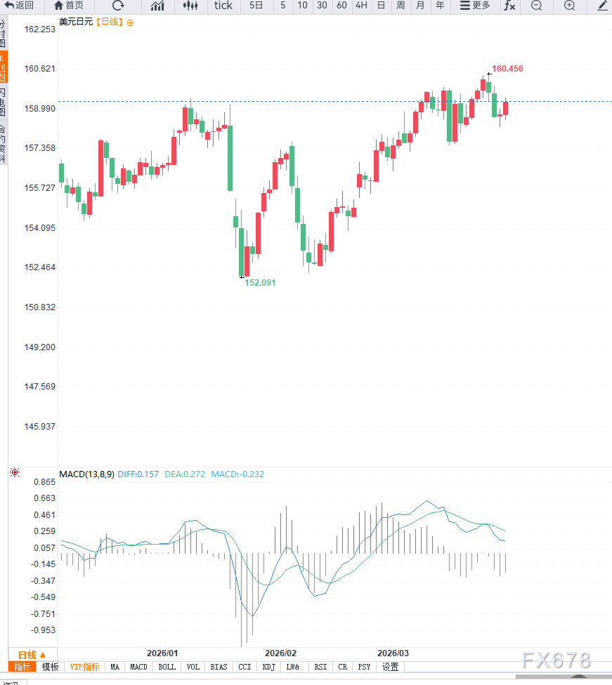 在4小时级别上,价格呈现加速上行走势,但短线已进入相对高位区域。技术指标如RSI接近超买区间,显示短期存在回调需求;MACD虽维持多头结构,但柱状图增速放缓,表明上涨动能边际减弱。若无法有效突破160关口,汇价可能进入高位震荡或技术性回调阶段