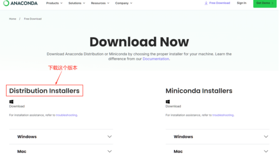 页面会有两个选项:Distribution Installers 和 Miniconda Installers