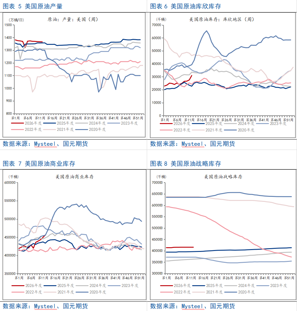 截至3月20日当周,美国原油商业库存当周增加692.6 万桶,至4.56 亿桶,增幅远超市场预期(预期 + 47.7 万桶),为 2024 年 6 月以来最大单周增幅。 库欣地区原油库存当周增加342.1 万桶,交割库库存显著累积。 汽油库存当周减少259.3 万桶,至 2.41 亿桶,成品油需求端表现相对稳健。原油库存超预期累积,叠加出口大幅下滑、精炼油库存意外大增,凸显美国原油市场供给过剩压力,市场定价逻辑从地缘风险溢价逐步转向基本面宽松主导。