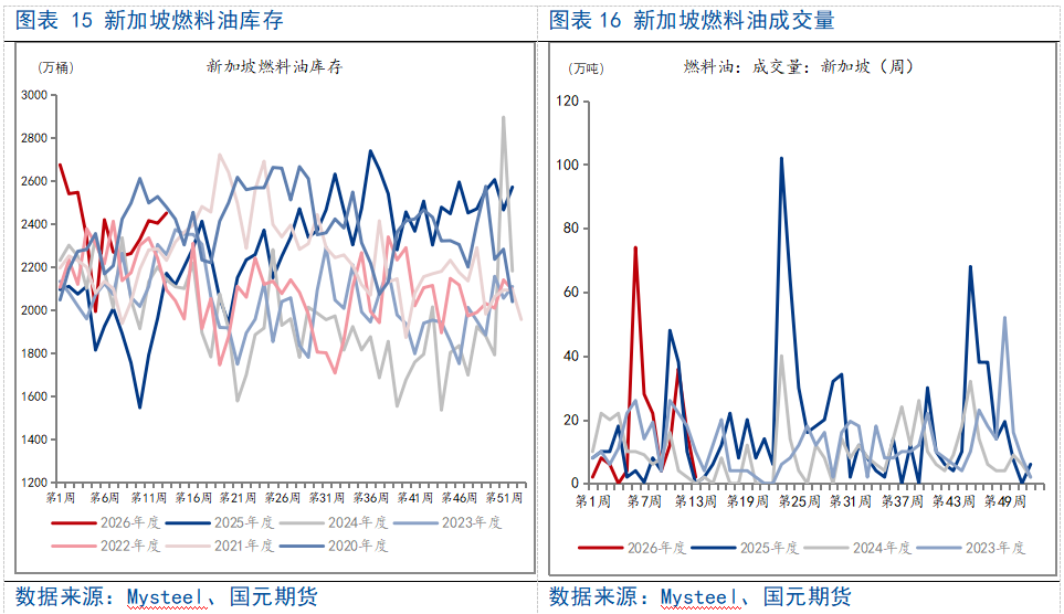 截至 2026 年 3 月 25 日当周新加坡燃料油库存数据显示,当地岸上燃料油库存环比小幅累库至 2450.9 万桶,连续三周维持 2400 万桶以上高位并创下十周新高,整体库存水平同比明显抬升、处于近五年同期偏高位区间;累库主要受前期中东货源集中抢运到港、俄罗斯及拉美高硫套利货持续补给,叠加燃油价格走高压制船燃即期加注需求、现货采购放缓影响,结构上呈现高硫货源库存充裕而低硫货源偏紧的分化格局,后期随着中东到港货源缩减、套利窗口收窄以及船燃需求边际修复,4 月新加坡燃料油库存有望逐步转入去库通道,整体基本面将趋于收紧,低硫品种紧缺逻辑或将进一步凸显。