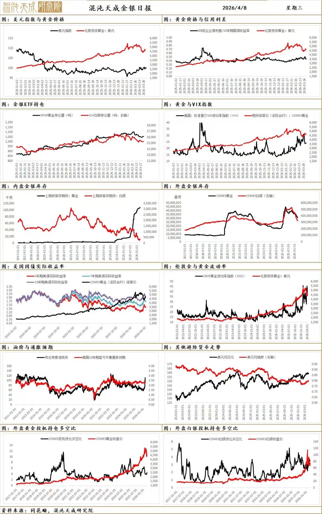 战争预期成为市场交易的主要因素,节中本受到特朗普“最终威胁”的影响,原油价格持续高位并形成对于贵金属的抑制。但随后美盘时间出现明显反弹,主要受到消息“美伊双方在巴基斯坦的斡旋下有望达成两周的停火协议”。1美国总统特朗普表示:“基于与巴基斯坦总理谢里夫和巴基斯坦陆军元帅阿西姆.穆尼尔的会谈,他们请求我今晚不要向伊朗部署破坏性力量,并且以伊朗同意完全、立即且安全地开放霍尔木兹海峡为前提条件,我同意暂停对伊朗的轰炸和攻击,为期两周”;2伊朗最高国家安全委员会发表声明称,根据最高领袖的建议和最高国家安全委员会批准,接受巴基斯坦提出的停火提议。该计划强调了以下几个基本要点:与伊朗武装部队协调,控制通过霍尔木兹海峡的通行;结束对“抵抗轴心”所有成员的战争,终结以色列政权的侵略;美国作战部队从该地区所有基地和部署点撤出;在霍尔木兹海峡建立安全过境议定书,确保伊朗享有主导地位;根据评估结果全额赔偿伊朗的损失;解除所有一级和二级制裁以及安理会有关决议;释放所有被冻结在海外的伊朗资产和财产;最后,所有这些事项都应在具有约束力的安理会决议中予以批准。