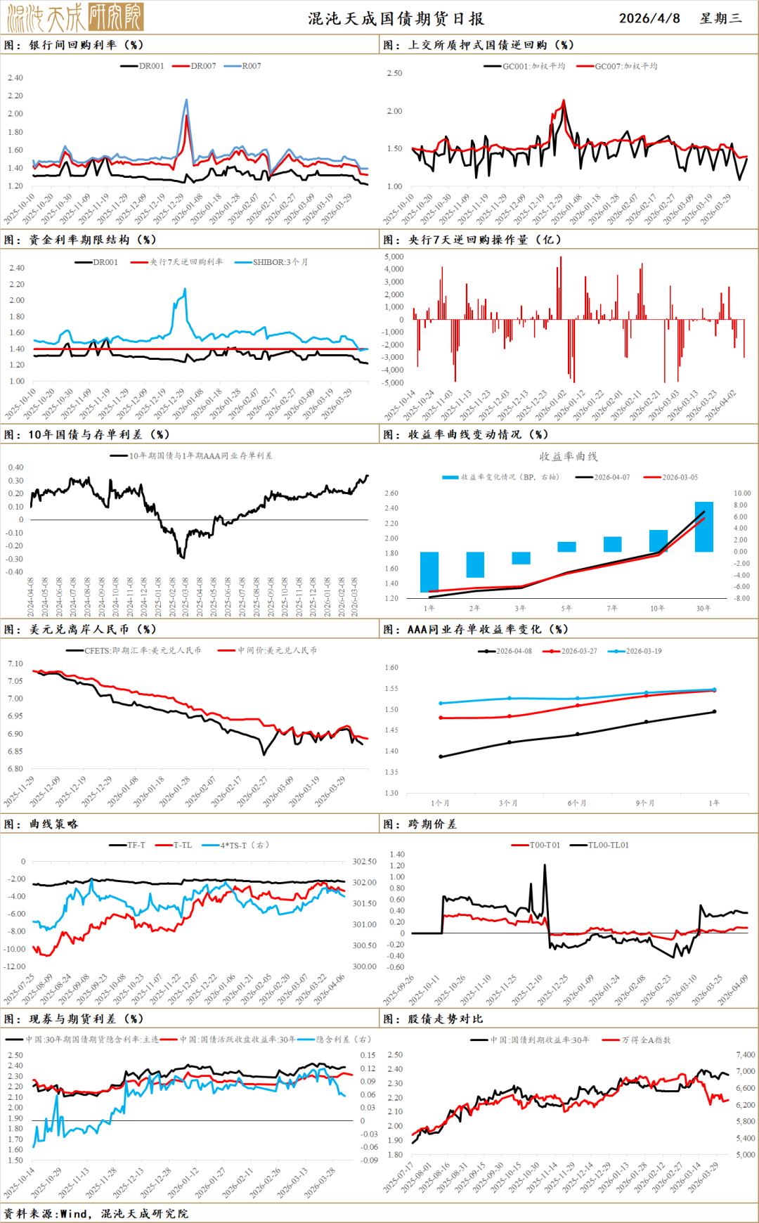 早盘市场聚焦特朗普对伊朗设定的最后通牒时限(美东时间4月7日20时),地缘政治风险急剧升温。避险情绪主导下,10年活跃券260005低开于1.814%并下探至1.8125%。央行开展5亿元地量逆回购,叠加8000亿元3个月期买断式逆回购,全口径净投放4985亿元,资金面维持极度宽松。午后,A股冲高回落,上证指数一度跌破3900点,进一步推升债市多头情绪,国债期货震荡走高。现券收益率震荡下行,10Y国债最低至1.81%。尾盘,随着权益市场小幅企稳及机构止盈盘涌现,现券收益率微幅反弹,10Y国债收于1.812%附近。全天交易盘在避险情绪驱动下活跃,超长债表现优于10年期。
