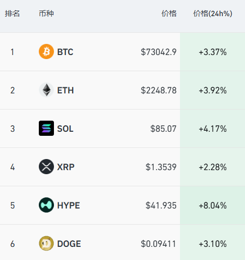 加密货币主要币种集体上涨,比特币涨至73000美元/枚上方,日内涨超3%,以太坊日内涨近4%。过去24小时,全市场超13万人被爆仓,爆仓金额3.87亿美元。