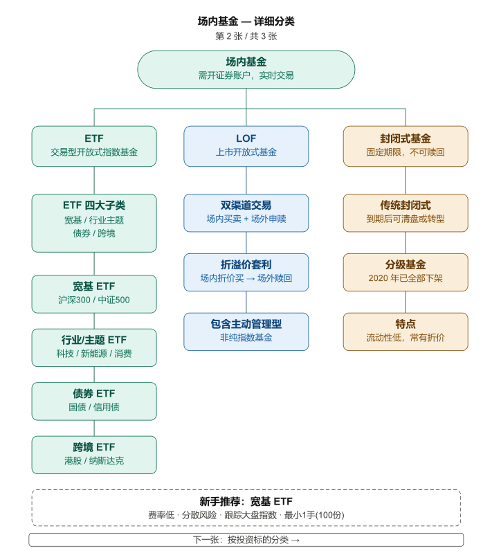 ① ETF(交易型开放式指数基金) 场内最热门的品种!像股票一样买卖,费率相对较低。ETF还能再细分: