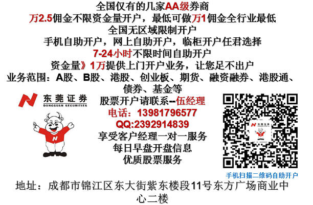 成都股票开户那家佣金最低 成都炒股哪家手续费最低 ,开户既享万二点五佣金,资金量大佣金更低哦股票随时看。公司支持手机客户端委托交易(拥有业内最优秀的手机交易软件满足您的随时随地交易),让你在繁忙的工作之余,操控你的股票。 成都欢迎联系我司张经理qq:1784363623 电话:18780025242联系我们即可享受更优惠的...