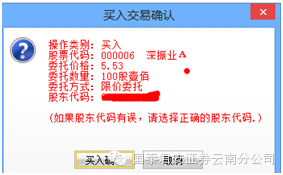 · 买卖股票:点击“买入”或者“卖出”菜单,即可进入股票买卖界面——以买入为例,如下图输入证券代码、买入价格、买入数量后,点击“买入下单”,在弹出的“买入交易确认”窗口核对信息后,点击“买入确认”即可;(T日买入的股票,T+1日才能卖出;T日卖出股票,资金T日可用于买入证券,但T+1日才能转出)