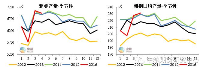 国家统计局14日公布的数据显示,4月份中国粗钢产量6942万吨,环比下降1.7%,由于四月份较三月份少一天,使得日均产量上升到231.4万吨,环比上升1.5%,超过了2014年6月的日均最高水平,虽然1-4月累计产量同比去年下降2.9%,但从1月以来的数据看,减少的幅度在不断降低,反映出供给端的不断恢复。目前看产量季节性走势比较明显,预计6月份之前产量将继续保持高位,对钢材价格产生打压。