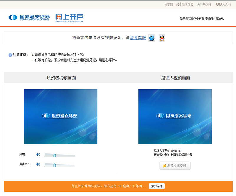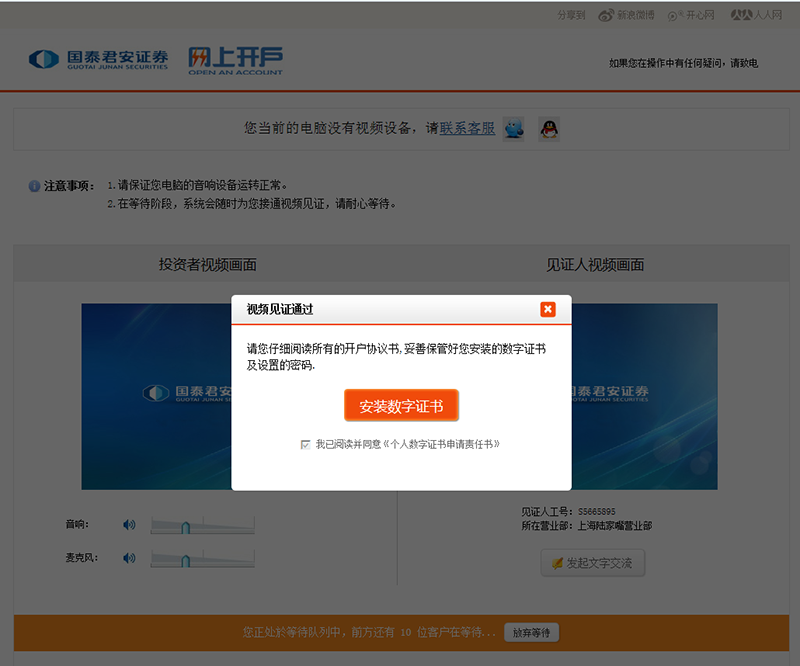 1)如果有多个用户申请视频见证,会在底部橙色区域看到等待人数,请用户耐心等待。 4)视频见证通过后,根据看到的弹出提示,安装数字证书。