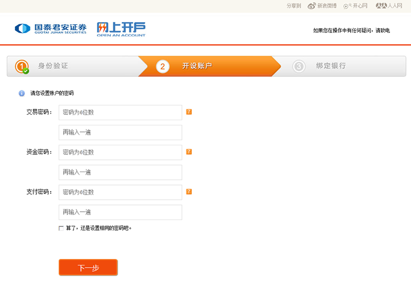 9. 开设账户——设置密码 1)系统建议用户只设置一套密码,便于记忆。用户也可以选择设置多套密码。