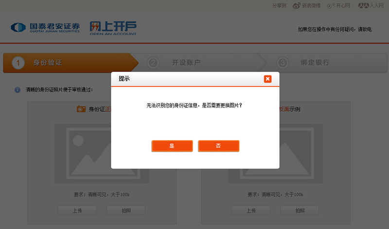 1)在此步骤,通过上传或拍照方式提交身份证正反面照片。