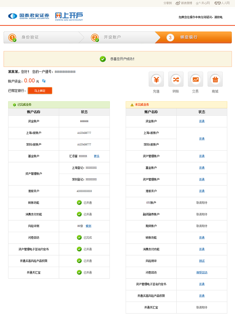 12. 开户完成 1)风险测评后,进入账户列表页面。按已开通账户和未开通账户区分,已经开出的账户可以查看到账号,未开通的账户可以点击“开通”进入开户流程。