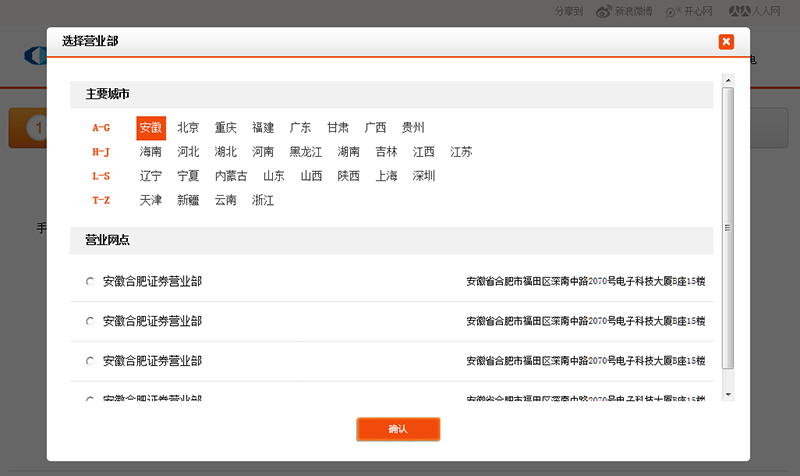2)系统会自动推荐开户营业部,用户可根据自己需要,点击“自选营业部”按钮,选择营业部。
