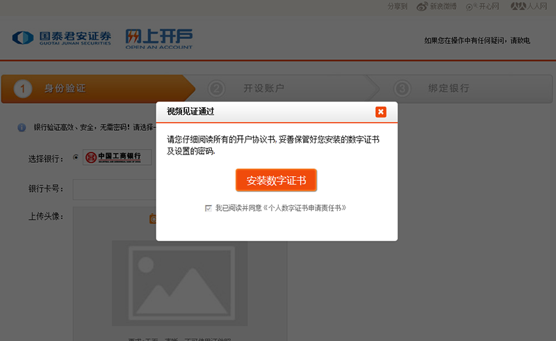 2)安装完成后,只需要点击“刷新”按钮,即可继续开户流程。