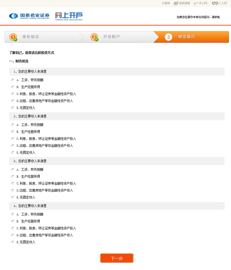 11. 风险测评 1)用户需完成全部测试题目,点击“下一步”按钮,可看到测评结果,并可以选择重新进行风险测评。
