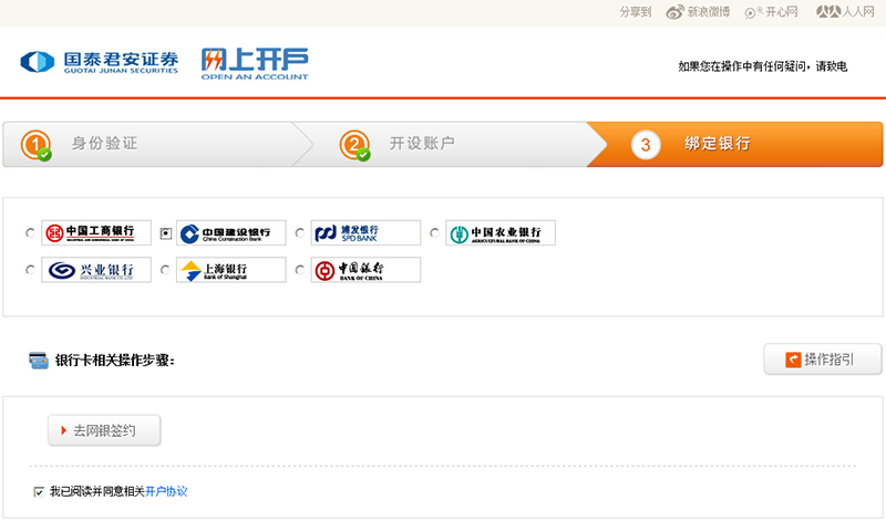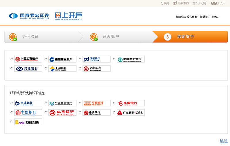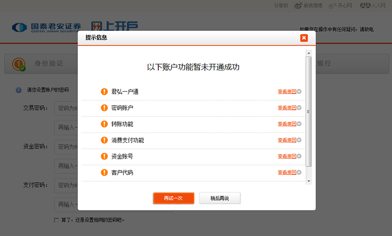 2)设置密码后,点击“下一步”,如果所有功能都开通正常用户可以绑定银行卡。只要有一项功能未开通,用户会看到下图提示。