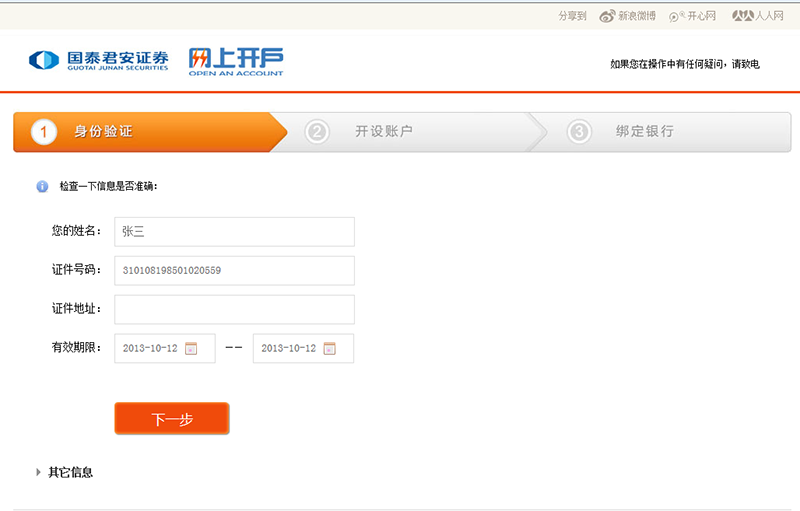 1)系统会将身份证正面照上的,姓名,证件号码,证件地址读取出来,并填写到页面上。用户需要核对,如识别有误可自行修改。 2)点击“其它信息”,页面将展开。其他信息由系统自动推断。允许用户核对后修改。