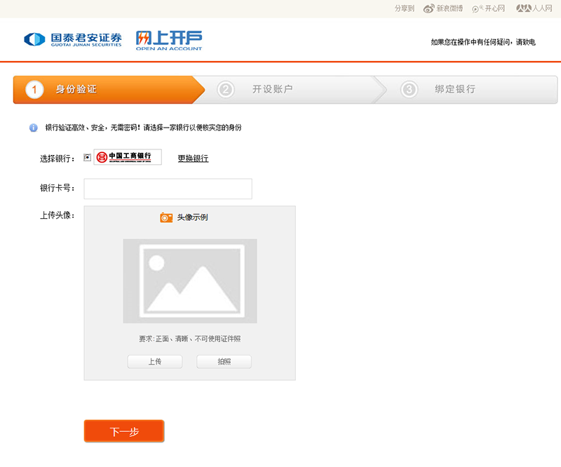 2)输入银行卡号并上传头像。点击下一步进行验证。