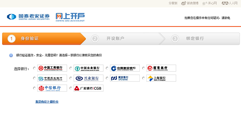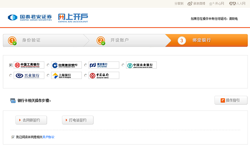 一、网上开户转户流程 1、第二代身份证正反面照片、麦克风、摄像头、耳机、手机 。 2、银行卡:目前支持银行卡十家:农业银行、工商银行(同一张卡可以关联两家券商)、建设银行(开网银)、中国银行(需开通电话银行)、兴业银行,光大银行、招商银行、上海银行,广发银行、浦发银行,平安银行、民生银行。(账户激活之后银行卡直接关联,不用再去银行办理关联业务,非常方便)。